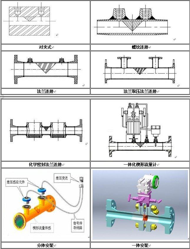 楔形流量計(jì)按其組裝方式分為一體型和分離型,按其連接方式分為法蘭連接、焊接連接、螺紋連接及對(duì)夾式連接,按其取壓方式分為普通取壓、法蘭密封取壓等結(jié)構(gòu)。