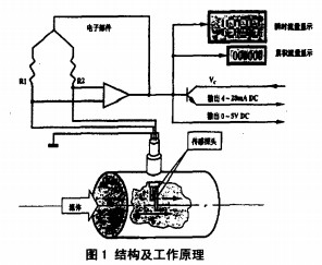 熱式質量流量計是利用加熱時液體溫度上升某一值所需的能量與液體質量之間的關系來測量液體或氣體質量的一種流量儀表。一般用來測量煤氣等氣體的質量流量。它具有壓損小,流量范圍度大,高精度,高重復性,高可靠性,體積小,易維護不易損壞等特點。早期的熱式質量流量計直接將加熱線圈和測溫元件放入液體中與液體接觸,是一種接觸式流量計,由于現場環境中普遍存在腐蝕、磨損及防爆問題,使它的工業應用受到了很 大的限制。到20世紀50年代,人們又提出了與液體不接觸的邊界層流量計,它克服了接觸式流量計的缺點,但測量結果受介質參數(如熱 導率,比率,粘度)以及環境的震動等的影響;到20世紀70 年代,基于測量液體溫度分布的熱分布型TMF,由于其獨特的優點在國內備受青睞,可它有一種致命的缺點測微小流量 ,僅僅適用于小管徑測量,大管徑液體測量它就束手無策,正是在這些流量計的基礎之上,人們又設計了一種插入式TMF,它在國內得到了迅猛的發展,可以用來測量大管徑的氣體流量。