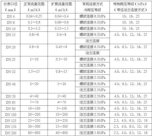 儀表口徑(mm)及連接方式 | 4、6、10、15、20、25、32、40采用螺紋連接 |