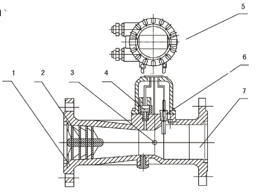 1、殼體2、旋渦發生體3、流量傳感器4、壓力傳感器5、流量積算儀6、溫度傳感器、7、導流體